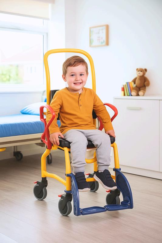 Two attended models are offered, with a choice of 3" or 4" castors, providing flexibility for different care settings and flooring types For children with greater mobility a selfpropelled model enables increased independence, featuring large rear wheels with push rims for easier selfmanoeuvring.