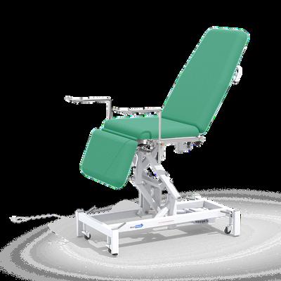 Engineered for modern clinical settings the GP Gynaecological Plinth offers enhanced clinician access and patient comfort through its ergonomic design and electric height-and-tilt adjustment including Trendelenburg positioning. The fully electric model features versatile leg support options, foot stirrups, knee troughs, or upholstered footpads and includes a sturdy stainless-steel tray for convenience and hygiene