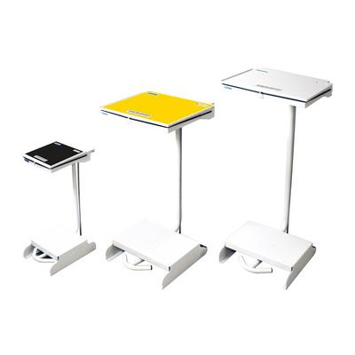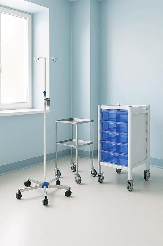 Built with a high-strength epoxy-coated steel frame, the range delivers exceptional durability while remaining easy to manoeuvre thanks to its four swivel castors, two of which are braked for secure positioning The low underride profile al ows smooth access under most beds and furniture while the base width is adjustable via a footoperated mechanism to accommodate different patient situations and equipment layouts