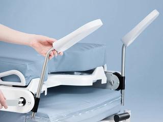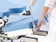 Ease of use is enhanced by the handset on electric models and manual Trendelenburg capabi ities (up to 12°) also ensure clinical adaptability. The lightweight yet stable leg section, along with the entire design, supports more efficient operation in fast-paced birthing suites The bed frame is CEmarked and MDR-compliant, with central locking and a lift system that supports up to 230 kg across all options