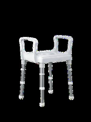 The Shower Chair features adjustable seat heights from 42–57 cm. It is also available without a backrest to meet specific space or therapeutic requirements.