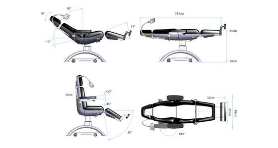 Ergonomic adjustments use reliab e gas spring mechanisms to control backrest, seat tilt, leg section, and extendable footrest, complemented by fold-back armrests and neck cushions to enhance patient positioning