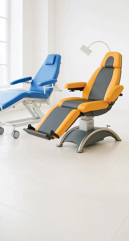Upholstery is designed with clinic safety and hygiene in mind: seamless-film gussets are used between sections to minimise dirt traps, and the material is MRSA-resistant, fireretardant, and available in 14 contemporary vinyl colours to suit any given interior scheme