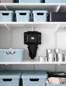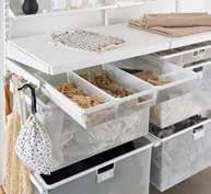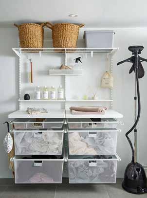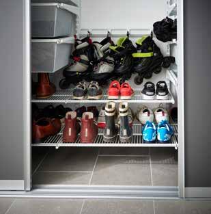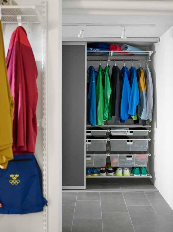 eller meshbackar, fick också plats för att förvara skoputsprylar. – Nu har det blivit mycket enklare. Vi har inte träningskläder uppe i huset alls längre, utan förvarar dem nere i källaren. Det innebär att vi inte behöver släpa upp plaggen till översta våningen, där våran ordinarie garderobsvägg står. Utan när kläderna har torkat kan jag vika in dem direkt i våra respektive meshkorgar som är namnmärkta. Alternativt placera dem direkt i träningsväskor, säger Johanna Wiberg som är