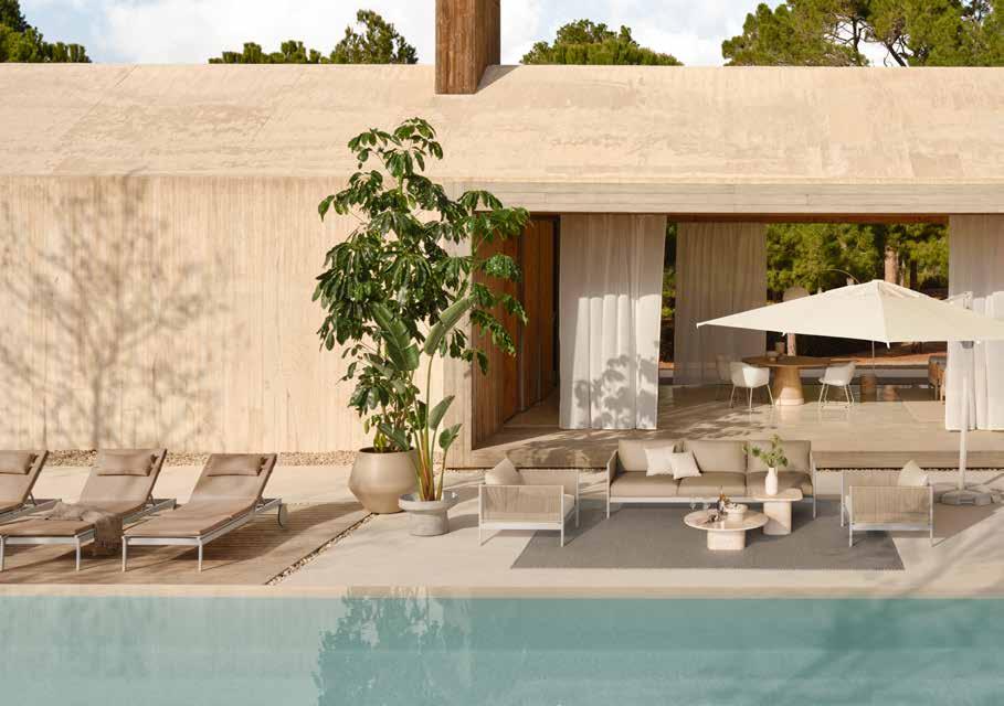 2025 ÄR ÅRET då ute och inne flyter ihop. Det ska kännas som ett rum utomhus, snarare än att gränserna är skarpa mellan vardagsrum och uteplats. Och användningsområdet är valfritt och fjärran den traditionella altanen. Känner du för att ha gymmet eller arbetsplatsen ute så fixar du det. Vill du istället ha en myshörna och ett filmrum där ute? Då slänger du ut en massa härliga dynor och puffar, kanske en stor divan.