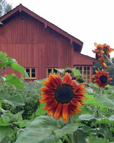 Ladugård målad i traditionell slamfärg med gulockra linoljefärg på fönsterbågar.