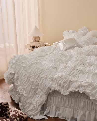 – Just nu älskar vi volanger och draperat! Uttrycket blir mjukt och drömmigt. Matcha sängkläder med överkast och härliga kuddar för att skapa helheten. Och det viktigaste av allt, jobba med olika texturer, mixa draperat, rynkat och volanger, säger Jennifer Åhman, Design Manager för