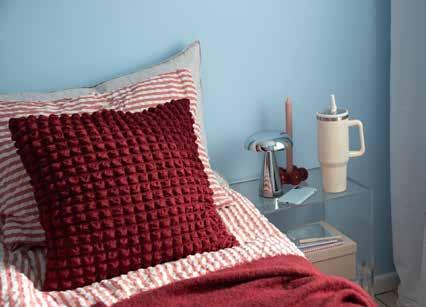 VAR INTE RÄDD för att föra in mer färg och taktila detaljer i din inredning. Är du vän av vitt och sterilt och tycker att burgundy känns lite dramatiskt? Du behöver inte börja med lurviga soffor i burgundy. Lyft in burgundy i de nedtonade färgerna och låt färgen ge rummet värme och dynamik. Du kan börja i liten skala med några ljus eller gardiner – om du gillar det är det bara till att avancera. – Det finns två riktiga vinnarkombinationer med burgundy i höst. Antingen går du på det klassiska och tidlösa spåret och mixar burgundy med vitt och beige. Den kombinationen känns alltid elegant och harmonisk. Eller så vågar du ta ut svängarna och addera ljusblått. Den kontrasten är överraskande och modern samt ger en trendig färgkick som verkligen fångar blickarna, säger Ulrika Landström, inköpare på Lagerhaus.