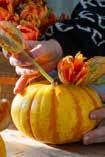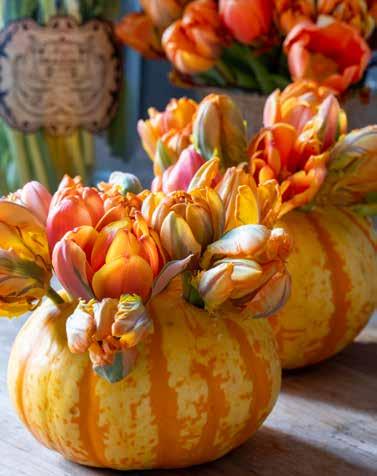 Karva ett större hål i pumpan, ta bort fruktköttet och placera en glasburk inuti. Häll kallt vatten i glasburken och sätt sedan ner tulpanbuketten i glasburken. Du kan behöva klippa bort lite mer av stjälkarna om det blir för vingligt beroende på pumpans och glasburken storlek. Vill du vara mer kreativ, gör mindre hål för provrör och stick in dem i pumpan. Fyll dem med vatten och arrangera blommorna i pumpan.