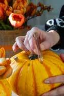 När pumpan är urholkad och tömd är det dags att skära ut ditt kalkerade mönster. Här krävs en skarp och gärna lite mindre kniv samt stor tillförsikt och noggrannhet. Du vill ju att pumpan ska bli snygg och att ingen skadar sig. När ansiktet är utskuret kan du med knivens baksida eller ditt finger putta in dem så de faller ned i pumpan och är enkla att ta ur. Placera försiktigt ljuset i pumpans botten och se till att det står stadigt innan du färdigställer din nya halloweenlyckta genom att sätta på det sparade locket.