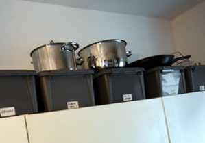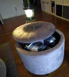 Om man lyfter blicken till ovanför köksskåpen ser man också välorganiserade och prydligt etiketterade plastlådor med saker som kan behövas och ett hörn finns ett gasolkök i miniformat dolt i en plastväska. I vardagsrummet döljer en puff ett överlevnadskit med bland annat triangakök och vevljus.