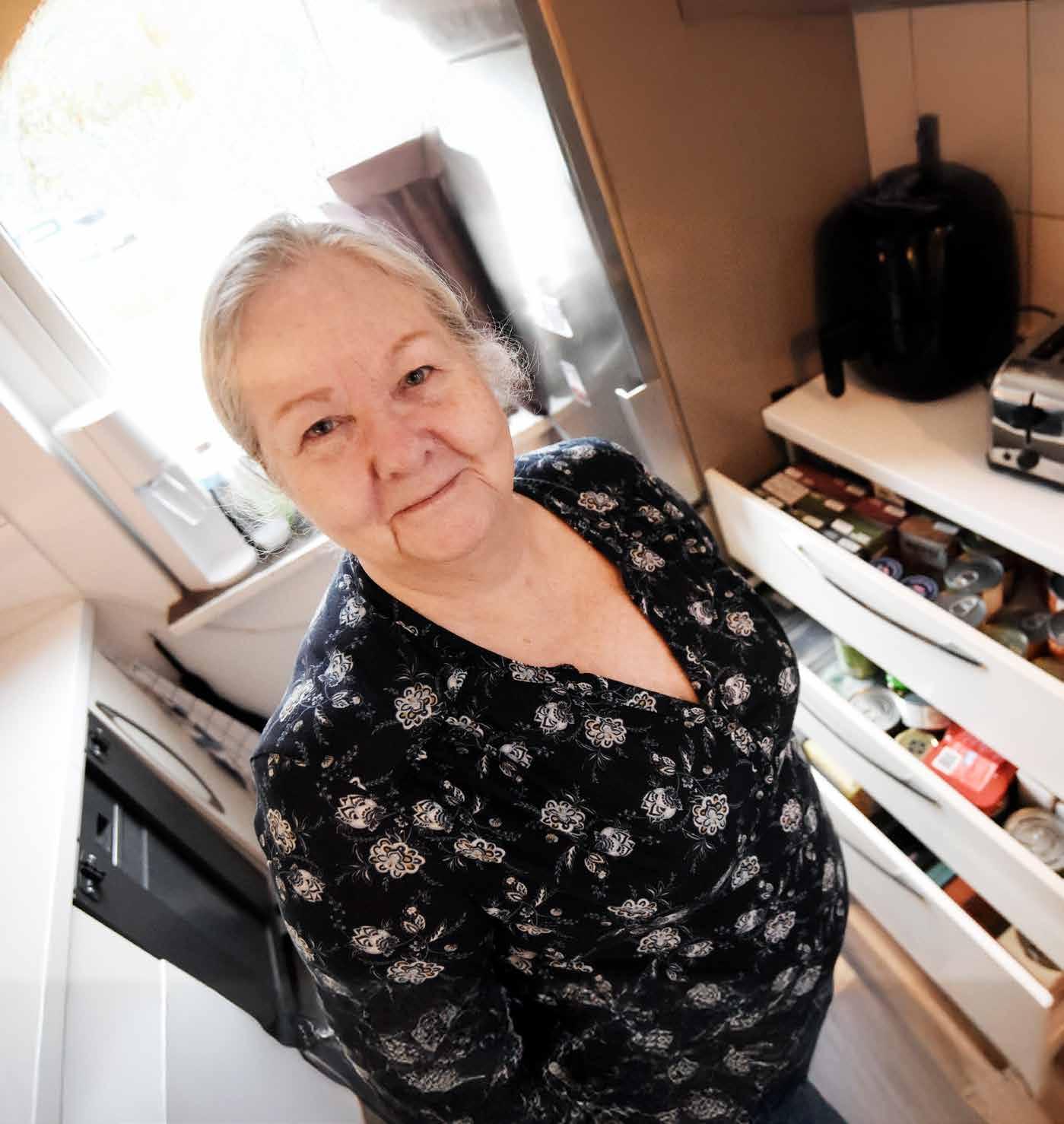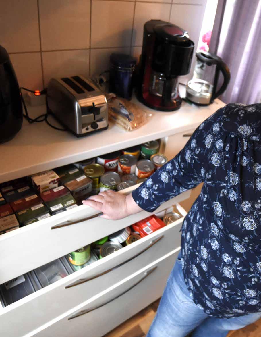 EN SNABB TITT runt i hennes lägenhet skvallrar mycket lite om att det här bor en prepper. Det skulle vara den tomma vattendunken som står i ett hörn på toaletten och vevradion i fönstret då. Men om man öppnar lådorna i köket ser man gott om torrvaror och konserver.