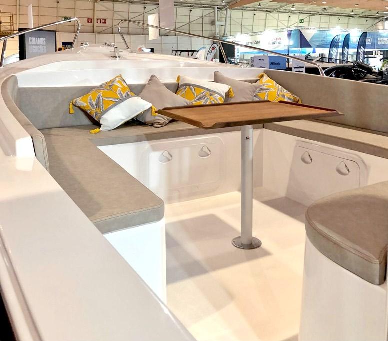 À frente o barco é bastante largo e tem bancos em U que se convertem num solário.