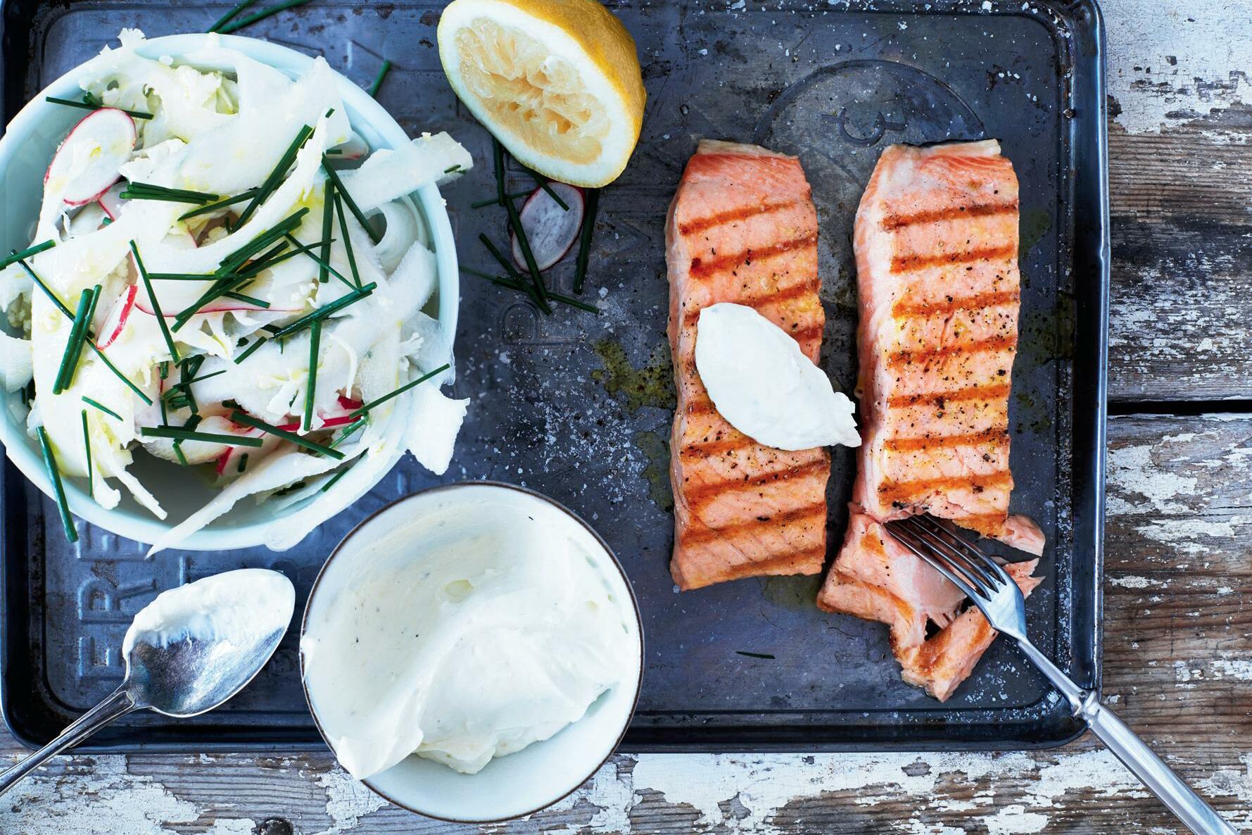 Skär laxen i fyra bitar, salta och peppra. Lägg laxen på grillen med skinnsidan uppåt. Vänd efter 23 min och grilla ytterligare 23 min. Servera laxen med salladen och krämen. Garnera ev med citronklyftor.