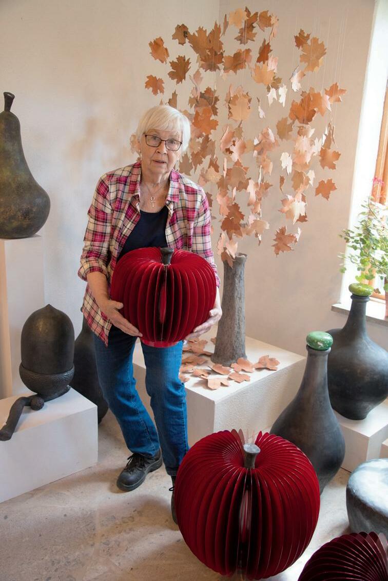 I snart 60 år har hon drivit Viklau Krukmakeri. Hon fyllde 79 tidigare i år men fortsätter utveckla nya alster inte bara i lera utan även i nya material. Betong, järnplåt, plexiglas … På väggen i utställningslokalen hänger spiralfjädrar och kättingar.