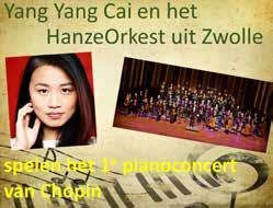 Hanze Orkest Zwolle met als soliste op de piano Yang Yang Cai | Pianoconcert Alvast als opwarmer voor het Hanzejaar speelt het aankomende Nederlandse pianotalent Yang Yang Cai samen met het grote Hanze Orkest uit Zwolle het 1e pianoconcert in e-mineur van Chopin. Het Hanze Orkest is het symfonieorkest voor gevorderde amateurmusici uit de regio Zwolle. Het bestaat uit beroepsmusici en vergevorderde amateurs en heeft op dit moment ongeveer 50 leden. Naast Chopin wordt ook wordt Prélude à l’après-midi d’un faune van Debussy ten gehore gebracht.