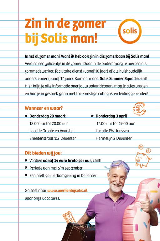 DEVENTER - Wil jij deze zomer lekker bijverdienen én iets goeds doen voor anderen? Bij Solis kan het! Al sinds 1267 (ja, echt!) staan wij dag en nacht klaar voor mensen die zorg nodig hebben in Deventer en omgeving. Of het nu gaat om hulp in huis of specialistische zorg, wij doen het met liefde en passie.