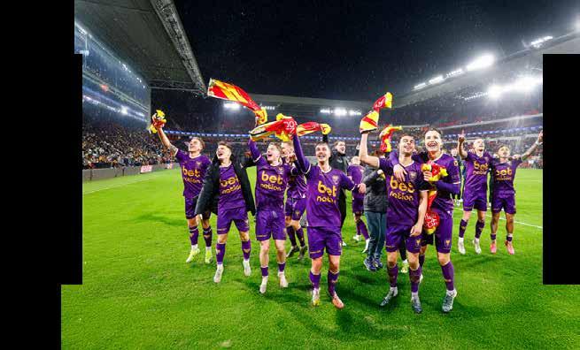 dan PSV, dan Utrecht, dan Feyenoord. Ik keek op de late zondag met enige spijt naar de stand. Het aantal punten, het aantal gewonnen wedstrijden, de data en statistieken, allemaal schitterend, maar de 25 vooraan bevalt me slecht. Dit gaat me te hard. Nog maar negen wedstrijden in deze competitie te spelen, nog maar negen keer deze ploeg in de groei. Aan alles voel je: dit Kowet is bezig aan een waanzinnige reis. Vlak na de wedstrijd waarin NEC Nijmegen, vorig seizoen nog een directe concurrent, totaal stuk was gespeeld, klonken al weer de strenge roodgele stemmen van ambitie. Het had beter gemoeten, nog beter, te veel ruimte weggegeven, te weinig gescoord, je proefde de honger naar meer. Na de euforie die de dubbele zege op PSV had veroorzaakt was er al weer de focus op wat nog komen moest. De ene na de andere speler, de ene na de andere jonge hond sluit zich aan bij het collectief dat op jacht is naar roem. En ik denk alleen maar: laat dit nooit eindigen, laat dit seizoen niet
