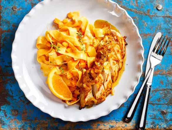 Stap 5: Verdeel de pasta over de borden. Trancheer de kipfilet en verdeel de stukken mooi over de pasta. Lepel tot slot de sinaasappelsaus over het gerecht.