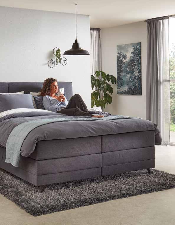 Moderne boxspring voorzien van een heerlijke koudschuimtopper en 5-zone pocketvering matrassen voor optimale ondersteuning. Standaard stalen designpoten en optioneel keuze uit een bijpassend voetbord, vele stofsoorten en kleuren. 180 x 200 cm vanaf 1899,-