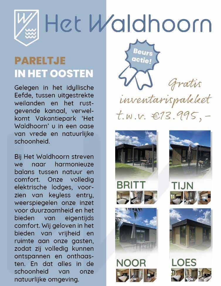 Het Waldhoorn in Eefde gelegen tussen de weilanden, bos en het Twente kanaal. Een oase van rust en natuurlijke schoonheid. Wij bieden vier modellen volledig elektrische lodges aan. Voorzien van onder meer keyless entry, airconditioning en vloerverwarming. U kunt een lodge kopen voor eigen gebruik, maar u kunt hem ook laten beheren en verhuren tegen een aantrekkelijk rendement. Wij regelen alles voor u. Wilt u meer weten? Kijk op onze website of bel ons.
