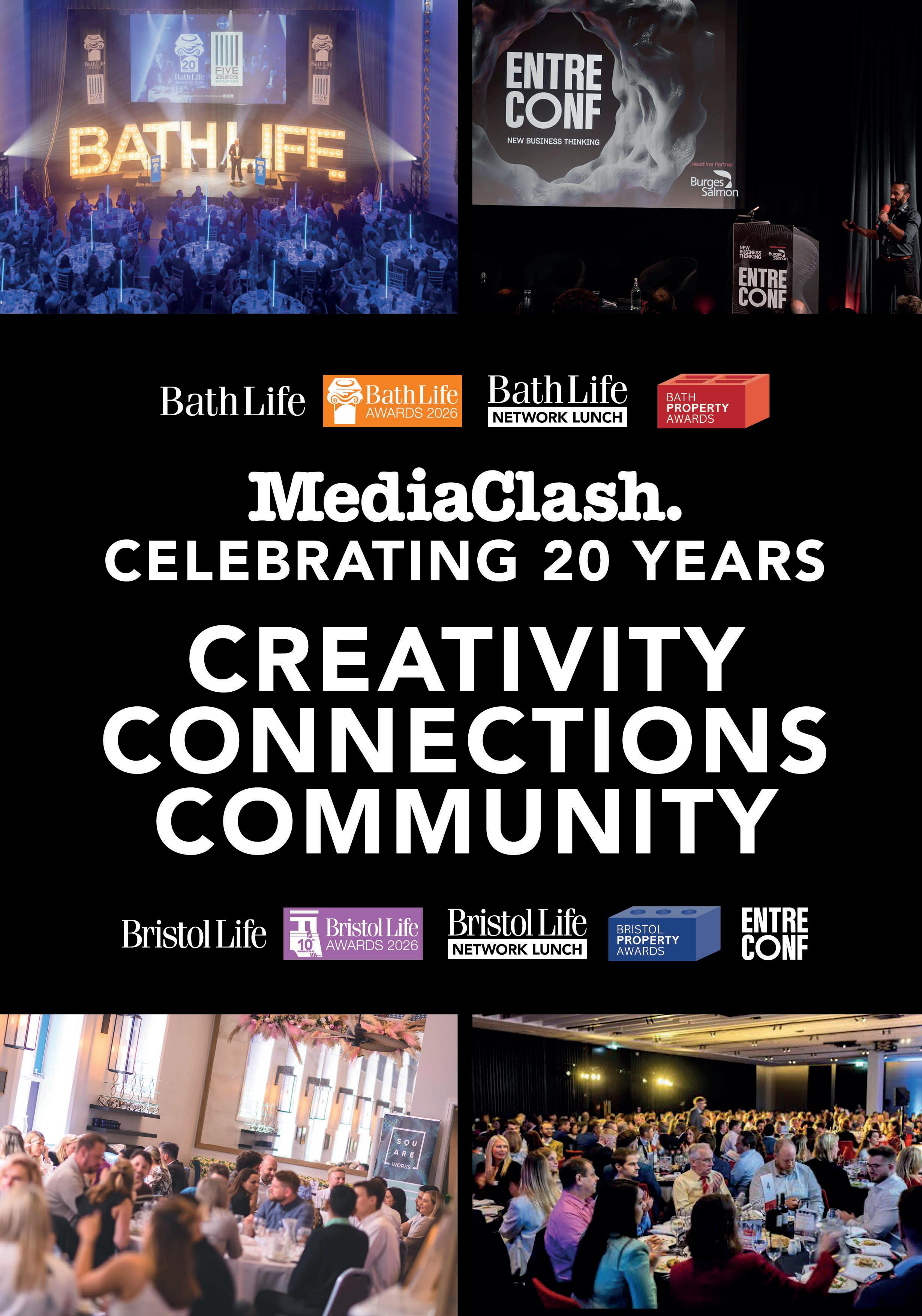 Leading regional media business MediaClash is celebrating its 20th year in 2026. It publishes Bath Life and Bristol Life magazines and produces multiple events each year, from networking lunches and business dinners to receptions, conferences and awards. The latter are led by the Bath Life Awards, Bath Property Awards and equivalents in Bristol and Exeter. It also runs EntreConf, the region’s leading conference for entrepreneurs: a two-day mindspa for new business thinkers, backed by EntreConf Dinners and also the EntreConf Awards. MediaClash is a co-founder of fast-growth paidmedia business Floresco.