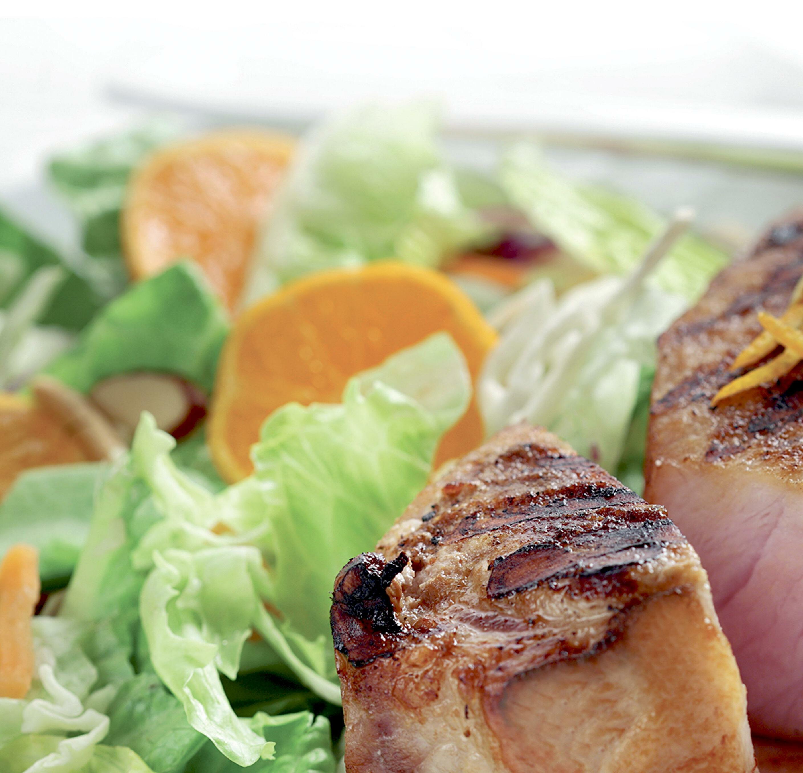 5. Remove chops from grill onto a clean plate. Tent loosely with foil and allow chops to rest3 to 5 minutes before serving. Garnish with remaining orange zest.
