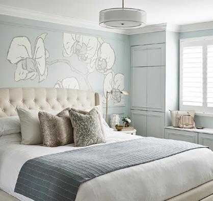 “It was the most stunning thing. I took a figurative approach and used the idea of orchids overhead as inspiration for my orchid mural above the bed. I sketched out an image on my computer, projected it onto the wall, traced it, and then filled it in with a harmonious palette of five Colour Spark paint hues .”