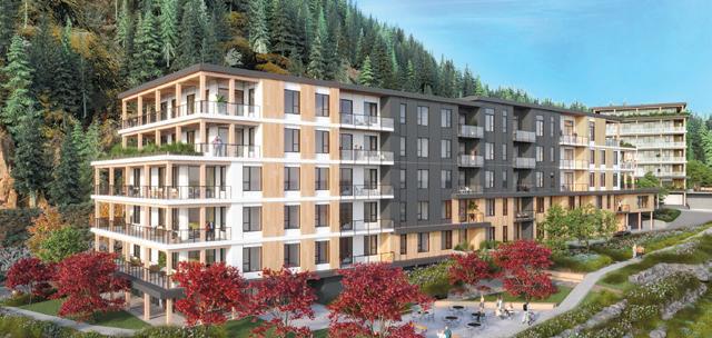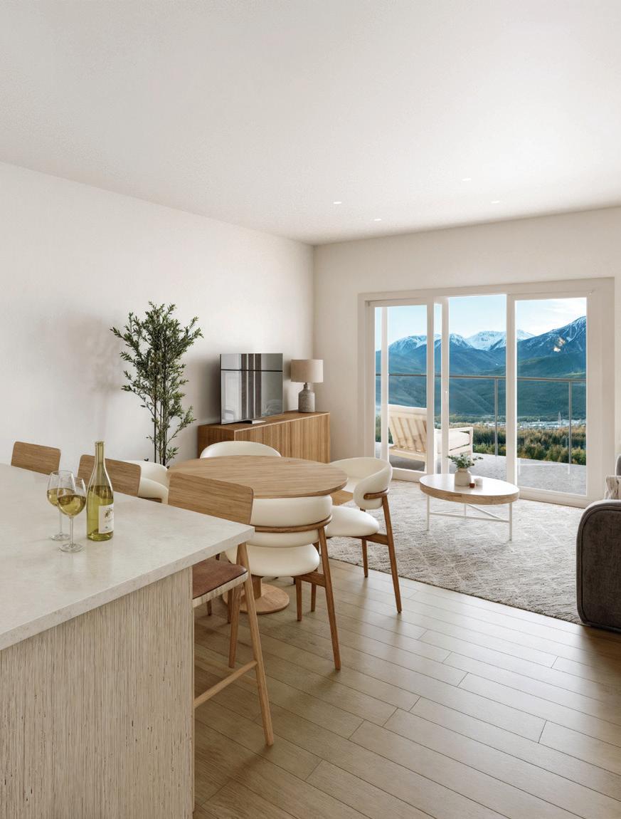 The 61 condo homes at Ossa North offer breathtaking views of Squamish and the Tantalus Range, which is home to the Ossa Mountain. Spacious, modern homes built to Step Code 3 of the BC Energy Step Code epitomize sustainable living, with high-quality construction, solar panel integration and energyefficient forced-air heating and cooling. Its design embraces the surrounding natural beauty with green roofs, natural colours and stepped architecture that mirrors the hillside, connecting seamlessly to lush forests and trails for hiking and biking. Extensive landscaping and tones of green and grey blend seamlessly with the stunning Squamish landscape.