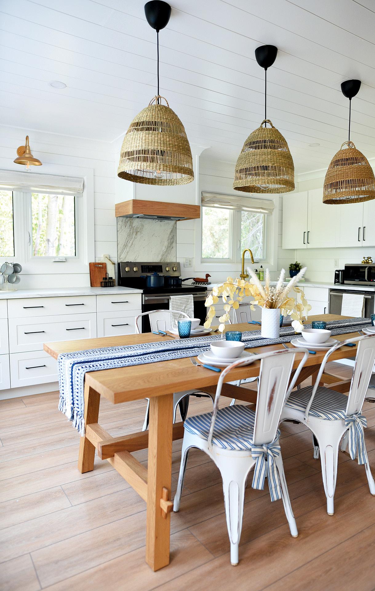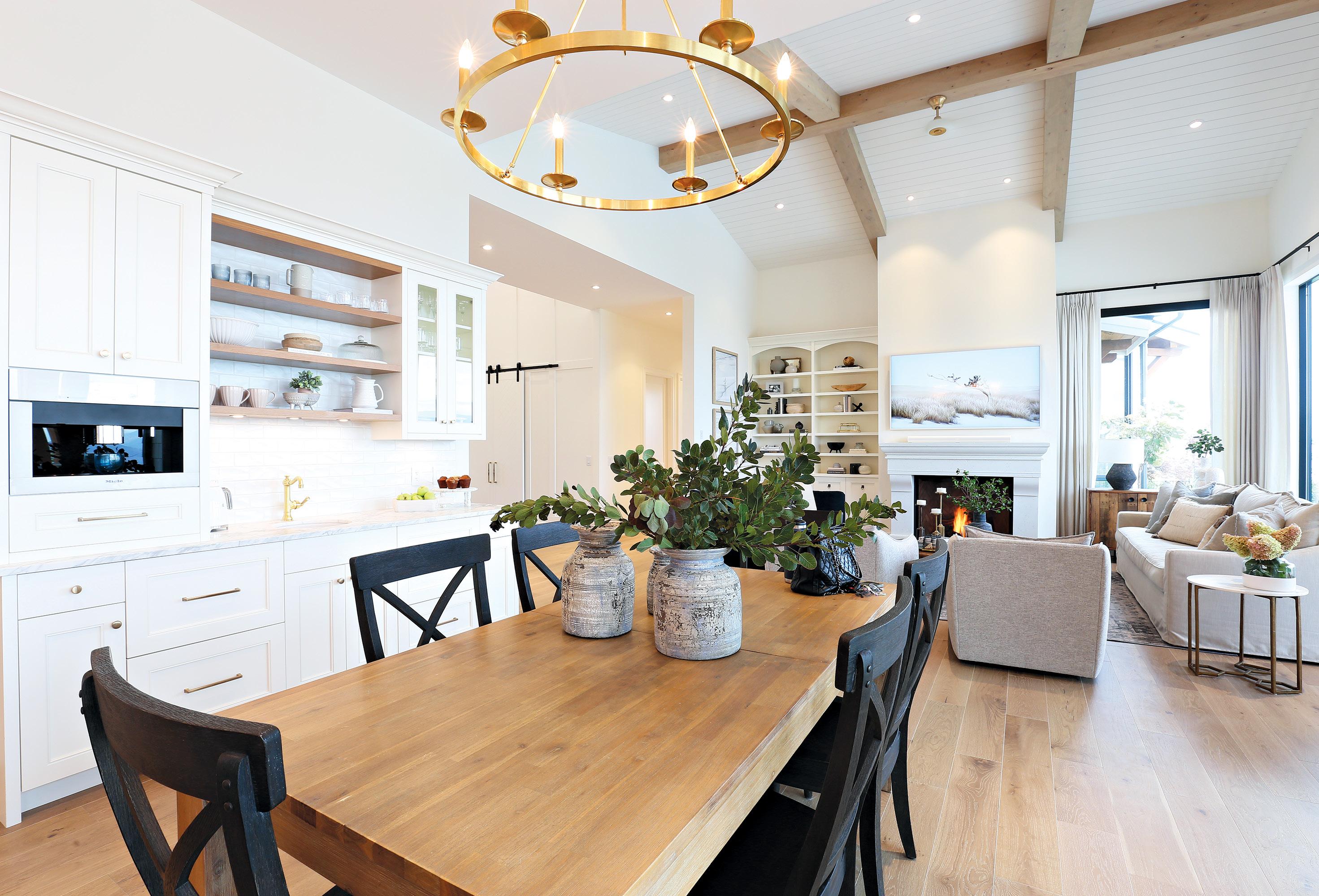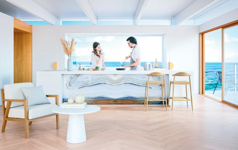 The overall palette was inspired by nature, and features wood tones with “watery” touches of blue, green and soft white. The palette flows from the kitchen into the adjoining open-concept living area. Retractable glass doors provide a