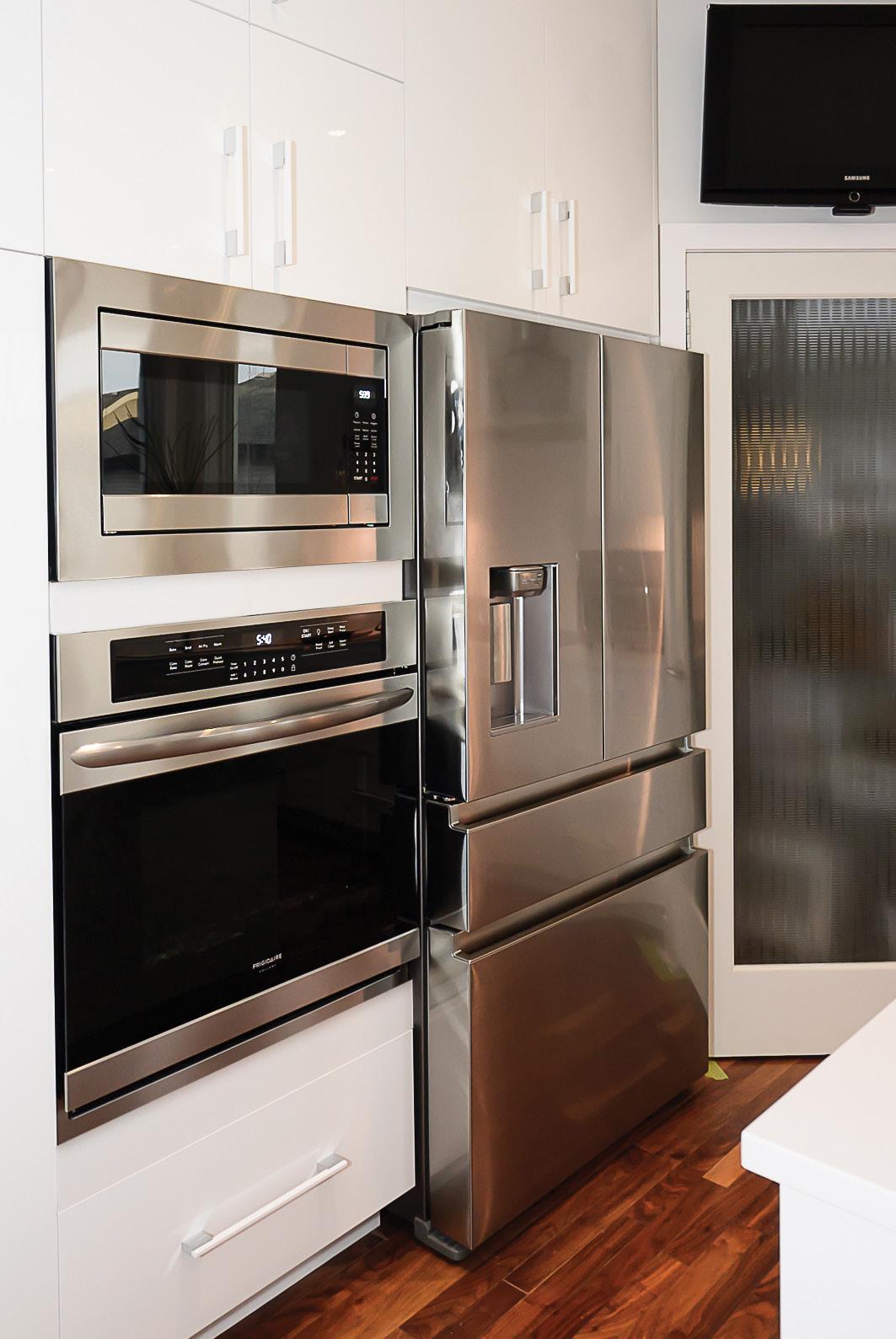 They still chose stainless steel appliances, but they are now wall-mounted making for a more seamless look.