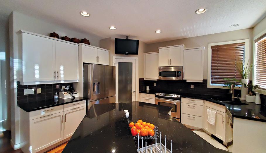 maximized the potential of their twostorey home with walk-out basement. The backyard is a great entertaining place, the basement has become a stylish and comfy entertainment/gym/ home office combo.