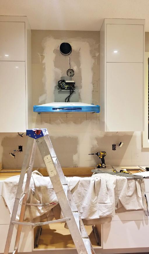 back ached for days.” He then had to take down the drywall and install new electric wiring for the new appliance configuration they were planning. “That’s where I needed more help from my electrician friends to help me figure out the required amperage,” he says.