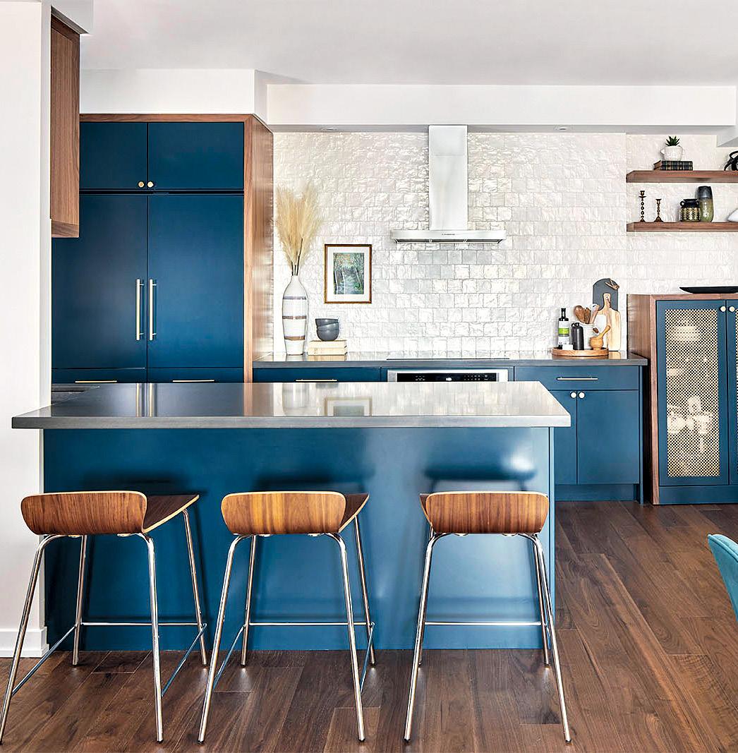 Beautiful marbles, quartz and warm wood tones are still a mainstay in our kitchens. Wood flooring is a definite, but so is adding wood accents in other areas of your space. A beautiful wood with a natural grain for a large island countertop can be a wonderful centrepiece, as can a beautifully grained walnut as an accent detail to portions of cabinetry. Accenting your bold-toned blue cabinetry with touches of a warm gold for your hardware will make it stand out even more.