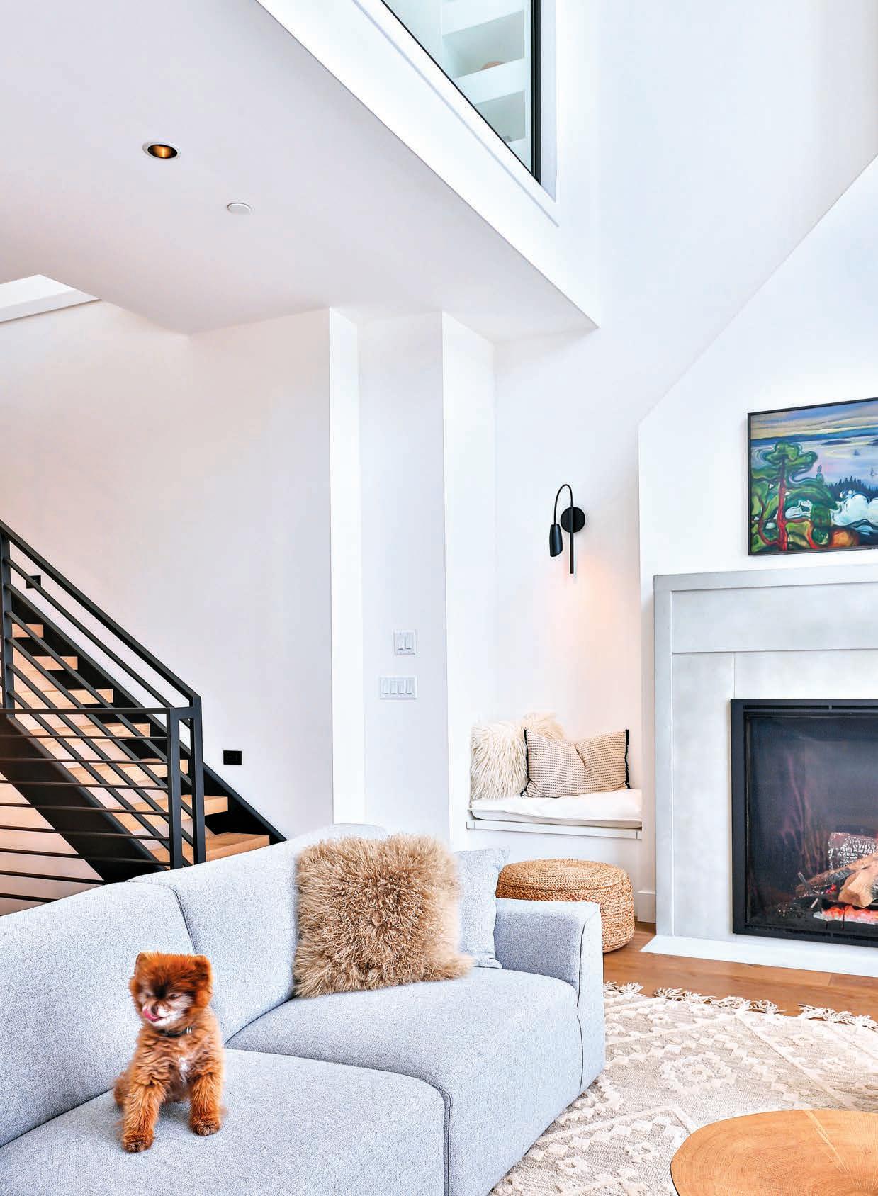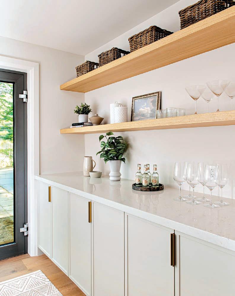 “Making the basement feel bright and integrating multiple storage areas were the two most important things in Danielle’s basement makeover. To make the space feel light and bright, I used a bright, creamy white paint colour on the walls called Sea Pearl by Benjamin Moore, and we installed lots of warm pot lights throughout the basement. For storage, we took advantage of all the awkward nooks and crannies in the basement and turned them into little hidden storage spaces with doors.”