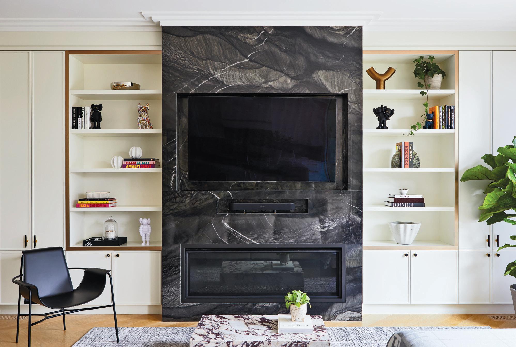 I personally love using built-in shelving to help highlight a focal point within a space, such as this fireplace flanked by open shelving. The secret to styling success is keeping your display simple and selective.