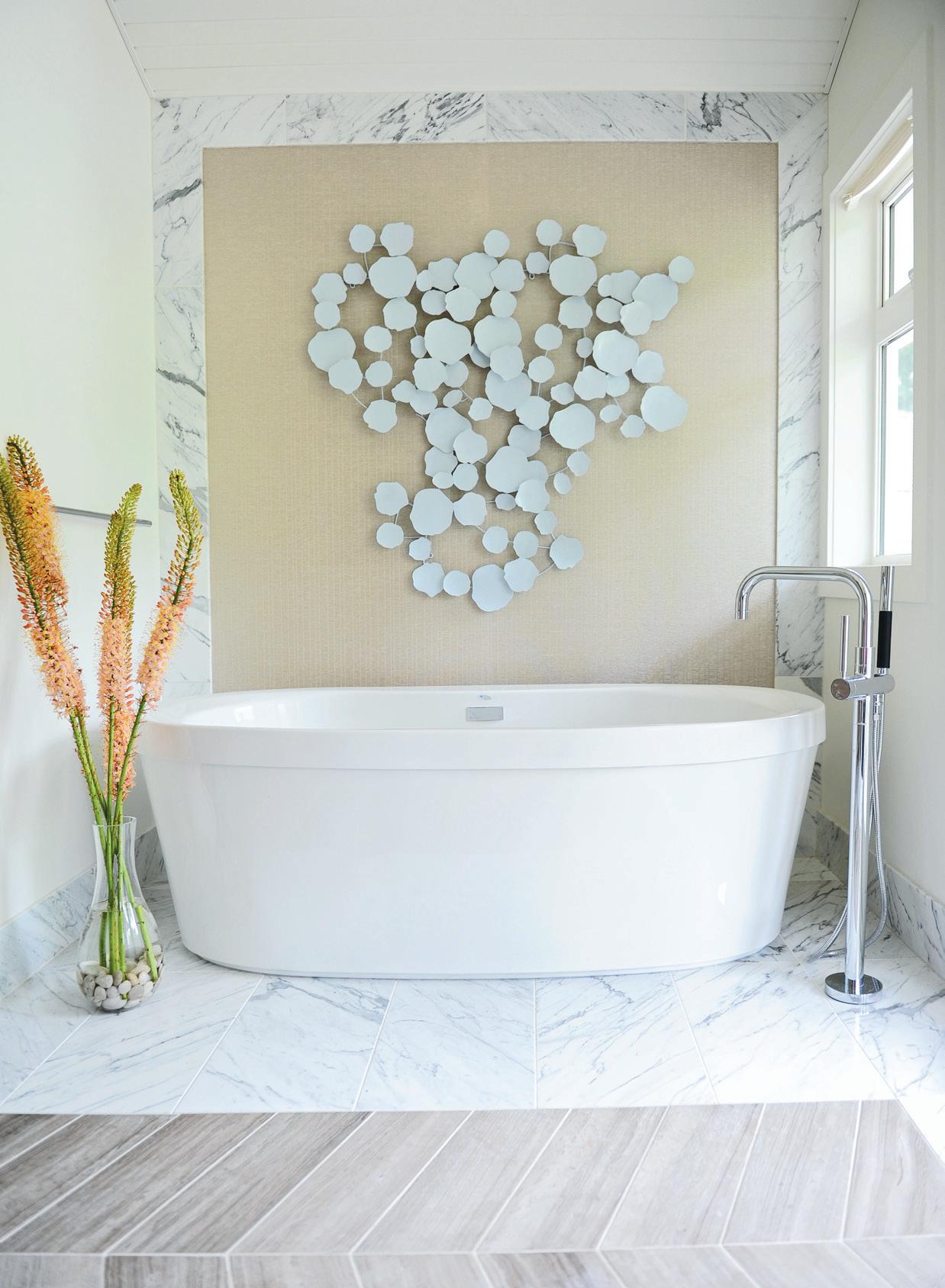 to gold or brass accents would have skewed the same room in a more traditional direction, amping up the opulence and volume levels. In addition, with our freestanding tub being 4 inches left of the middle due to plumbing challenges, we cheated the placement of the chandelier above to be centered to the tub, creating the illusion of a fully balanced and centered vignette (designer tip: light fixtures are an easy way to trick the eye and reset a midpoint).