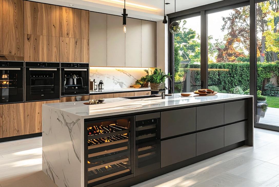 The kitchen’s porcelain countertops and backsplash play a pivotal role in shaping its character and durability. The Italian-made material mimics the elegance of natural stone, while offering a nearly indestructible surface, ideal for a home with several enthusiastic cooks. Heat resistance, stain protection and a consistently smooth finish ensure the counters remain pristine, from late-night