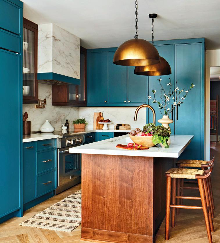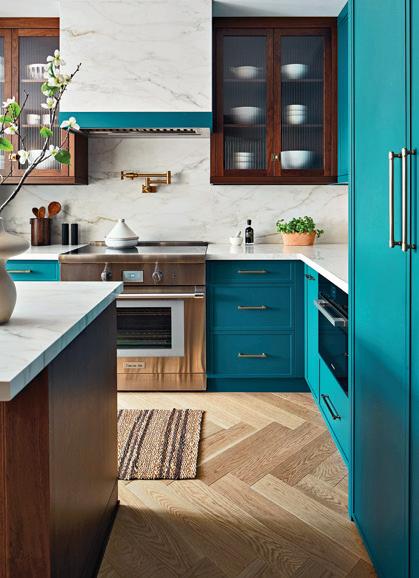 cabinetry in mind, two complementary finishes were used for the cabinets. Walnut offered added warmth and a grounding aspect without competing with the teal, and brass hardware and fixtures provided the sophisticated feel the homeowners were seeking.