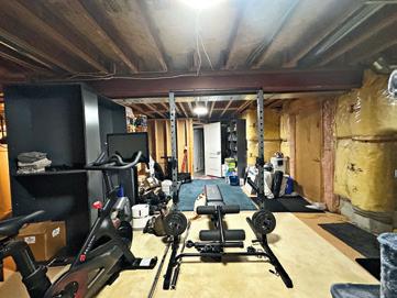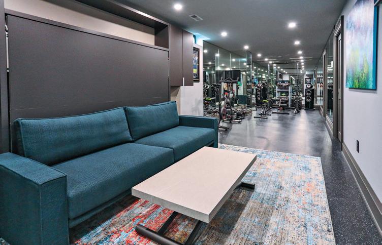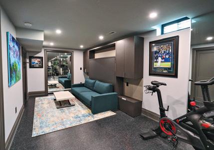 Previously, the workout area was situated in an unfinished space. The renovation combined exercise equipment with an attractive, mirrored wall to support workouts, a sleeper sofa and a discreet pocket door to allow the room to convert effortlessly into a private guest room.