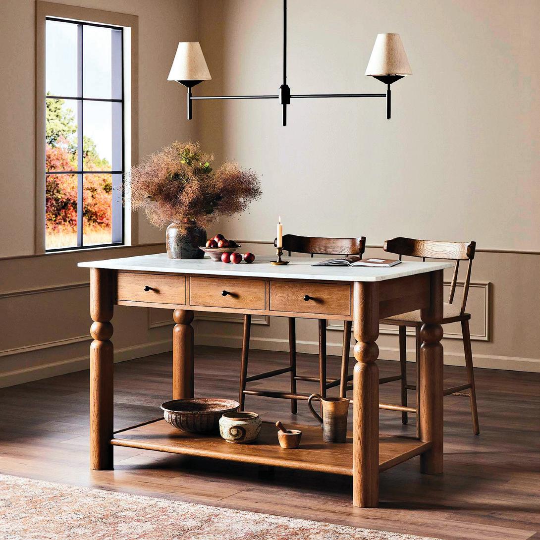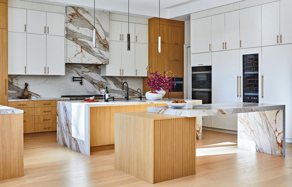 A double island configuration became indispensable for this family’s lifestyle. The primary island functions as the cooking hub, complete with a generous sink and expansive prep space. Parallel to it, the second island shifts roles effortlessly throughout the day: Breakfast table during school mornings, homework spot in the afternoon and a natural serving station when the home fills with guests. Together, the paired islands create a dynamic flow that supports connection, efficiency and ease.