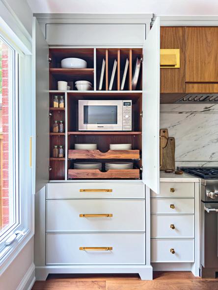 Every inch of usable space is maximized, including concealed cabinetry with push-latch doors on the back of the island. This hidden storage keeps rarely used dishes, seasonal items and entertaining essentials accessible yet out of sight, reinforcing the kitchen’s uncluttered aesthetic.