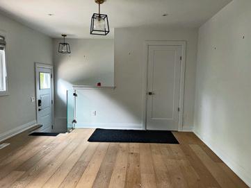 for shoes and coats. Ahead, a set of stairs leads to the second floor while on the main floor, the living room and dining room flow into each other and end at the kitchen, a separate, walled room located at the back of the house. Before the renovation, the kitchen doorway was 36-inches wide.