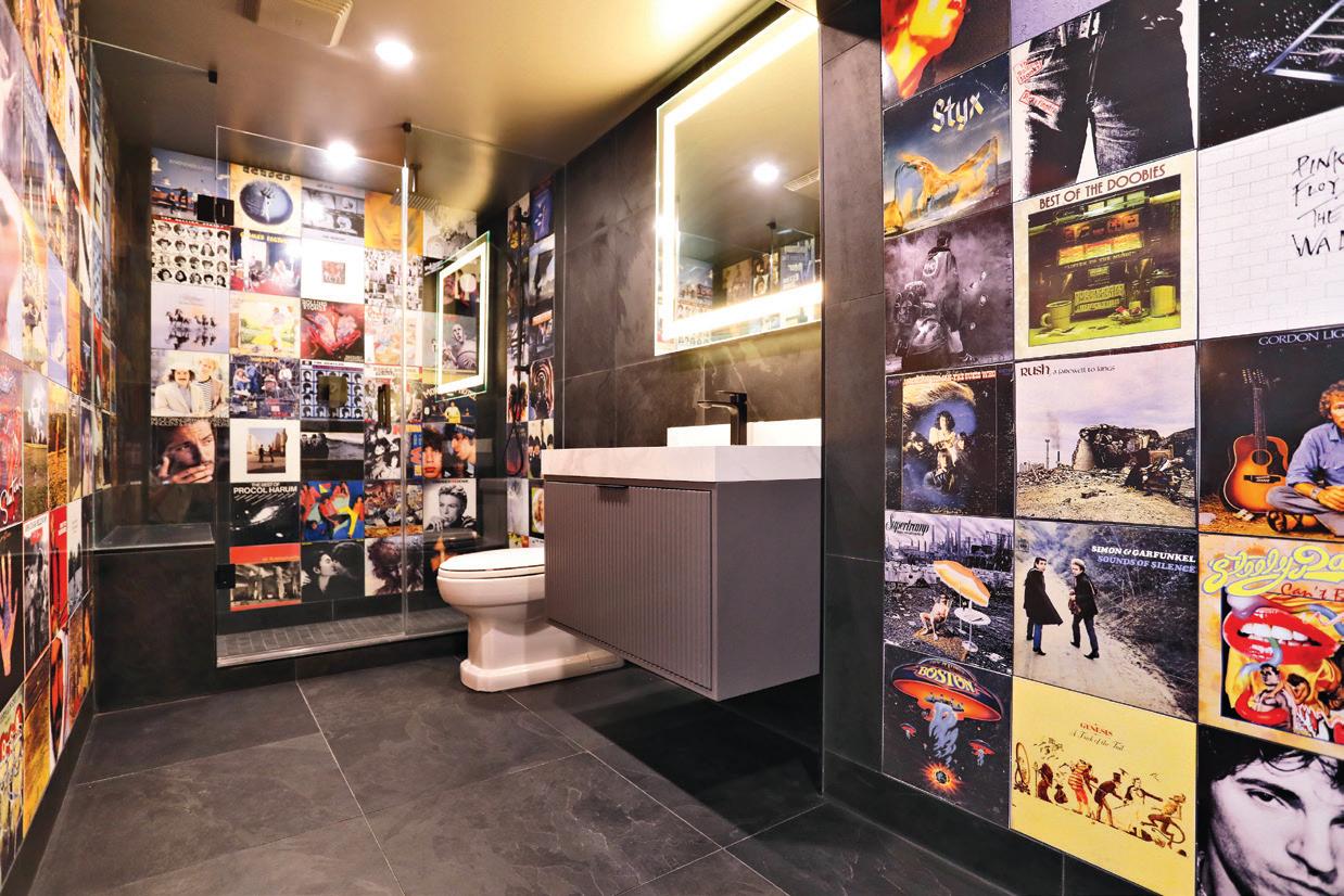 “I’ve loved music passionately since I was nine or 10 years old,” says the homeowner. “When I renovated my basement washroom, I wanted to create something unique, a tribute to the music and the artists that have meant so much to me for so long.” That authenticity became the guiding force behind every decision.