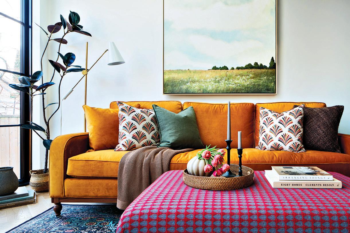 Expressive colour palettes such as jewel tones and warm ochres were incorporated instead of the neutral beige and grey palettes long favoured in home decor, and as a nod to the client, who is an artist, a wall was kept blank as a gallery to exhibit her artwork.