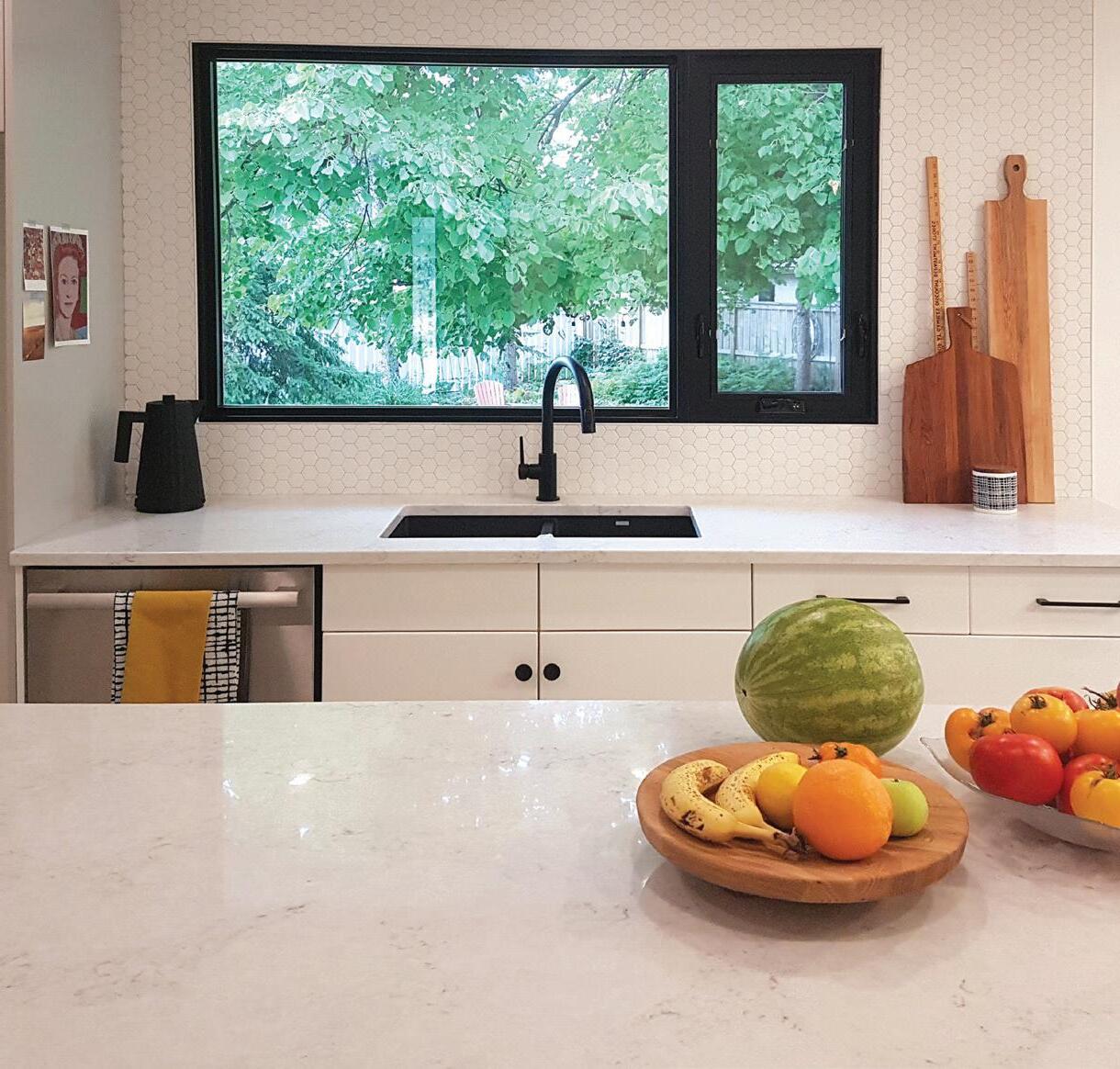 “The original kitchen was small, cramped and made no sense,” says Crezel. “The floors were deep red Marmoleum, the lower cabinets were dark brown and the upper cabinets a few shades off from the pale mauve walls. All colours and materials were competing, and the room was distracting and cold.” The redesign not only focused on improving the kitchen, but the extra square footage also allowed for the addition of a