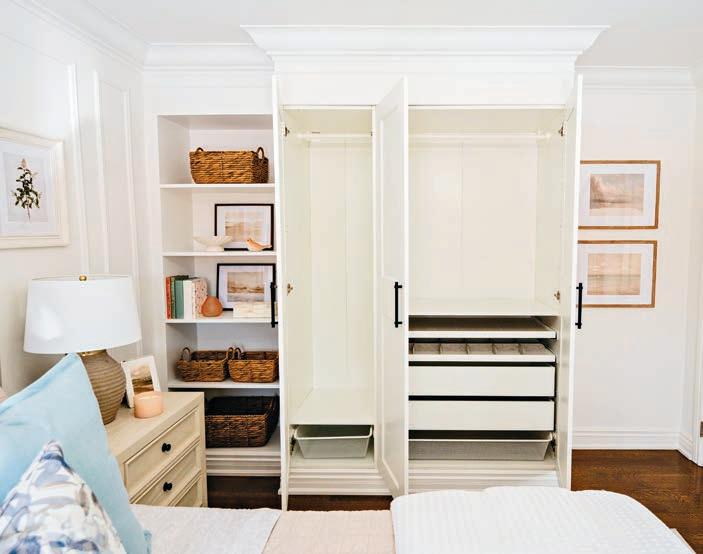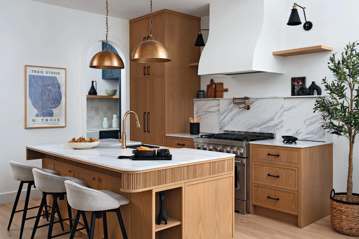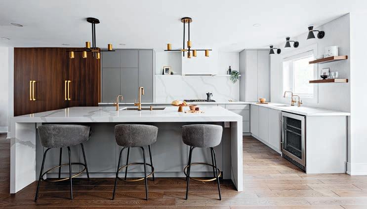 environment. This was achieved by embracing a minimalist approach, removing visual distractions and focusing on clean lines. A soft palette of neutral tones keeps the space feeling open and airy, while surfaces are intentionally streamlined with cabinetry that extends from wall to wall. By eliminating traditional handles and hardware, the cupboards take on a sculptural quality. Instead of pulls and knobs, the family enjoys electrical opening systems and soft-close technology. A light touch activates drawers and doors, and the quietclose adds safety and serenity, even during the busiest times of day.