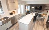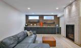 This modern kitchen and family room feels like a tropical paradise. Quartz countertops and backsplash keep this kitchen bright. The family room includes a feature wall with linear fireplace. A glass railing provides open sightlines for everyday life and entertaining.