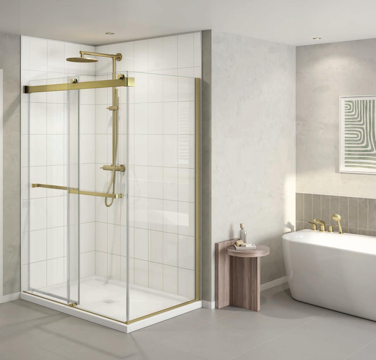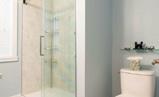 Fixed glass shower panel in place of a door. Great looking & easy to maintain.