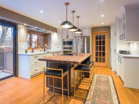 We transformed this kitchen into a beautiful, warm and functional space. Some of the features included were: quartz countertops, custom millwork, a coffee bar and a large island perfect for entertaining.